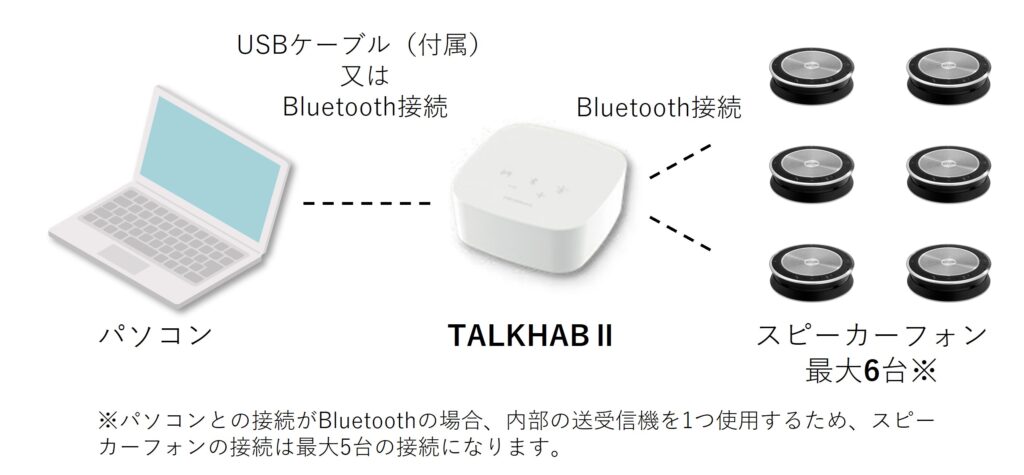 - 参加人数が10人程度の時はTALKHUB Ⅱにスピーカーフォンを2台連携