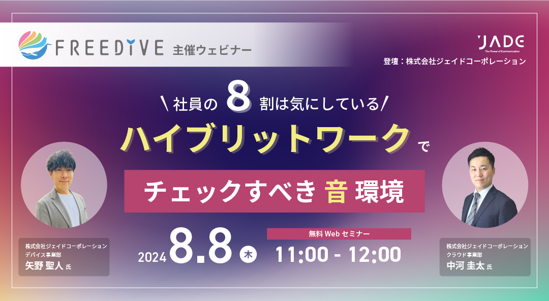 今回は20年以上の音響デバイス販売の知見を持つ株式会社ジェイドコーポレーションが、ハイブリットワークに時代に必要な「場所」と「距離」を問わず、社員の生産性と満足度を向上させるための必要なポイントをお伝えするWEBセミナーを開催いたします。